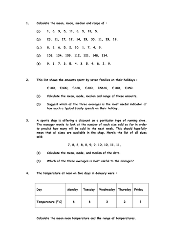 Mean Median Mode Range Worksheets - Math Salamanders Mean Median Mode Range Worksheets These printable mean median mode range worksheets have been carefully graded to ensure a progression in the level of difficulty. The first sheet involve finding the mean, median, mode and range of some positive whole numbers. The 2nd sheet involves the use of decimals to 1dp.